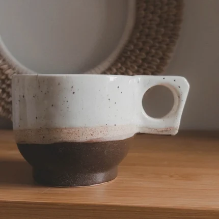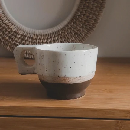 - CECHY: Porcelanowy Kubek Travel Boho Biały Nakrapiany 260 ml 100% handmade. Posiada unikalne i proste akcenty.