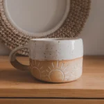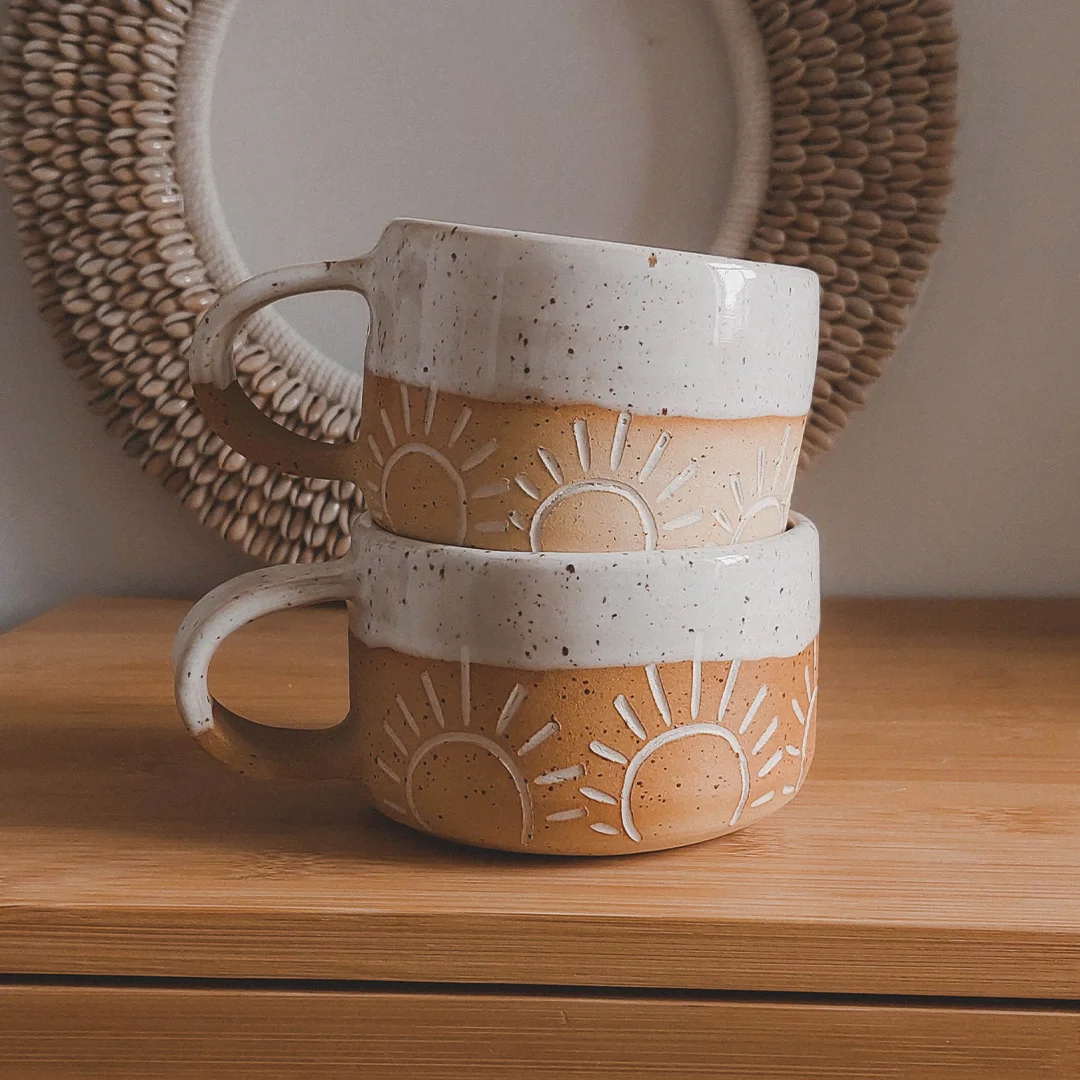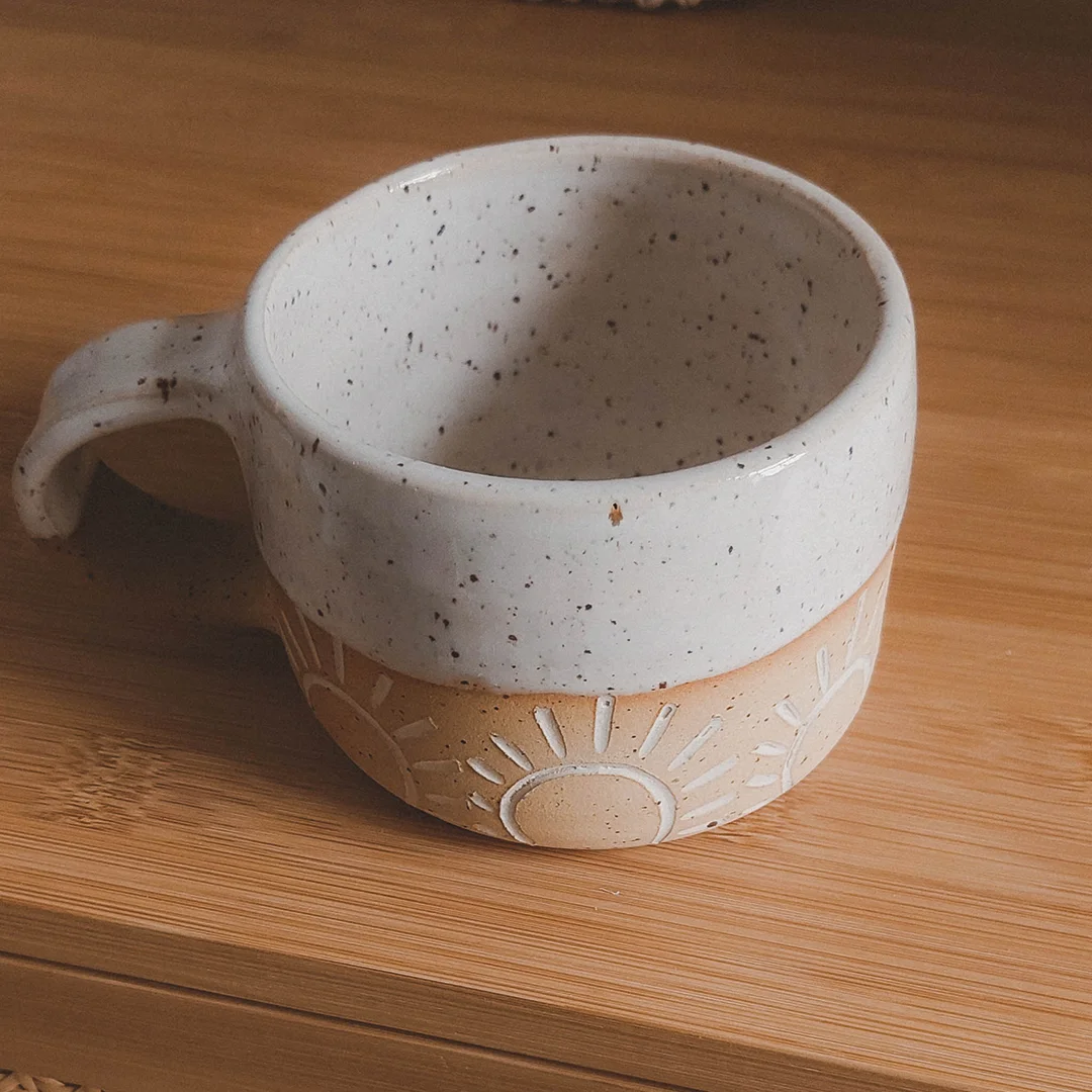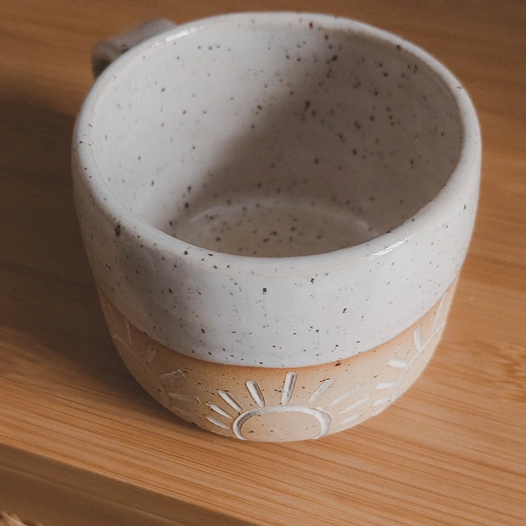 - CECHY: Ceramiczny Kubek z Beżowej Nakrapianej Gliny 320 ml 100% handmade. Posiada unikalne, ręcznie rzeźbione akcenty i prosty wygodny uchwyt.